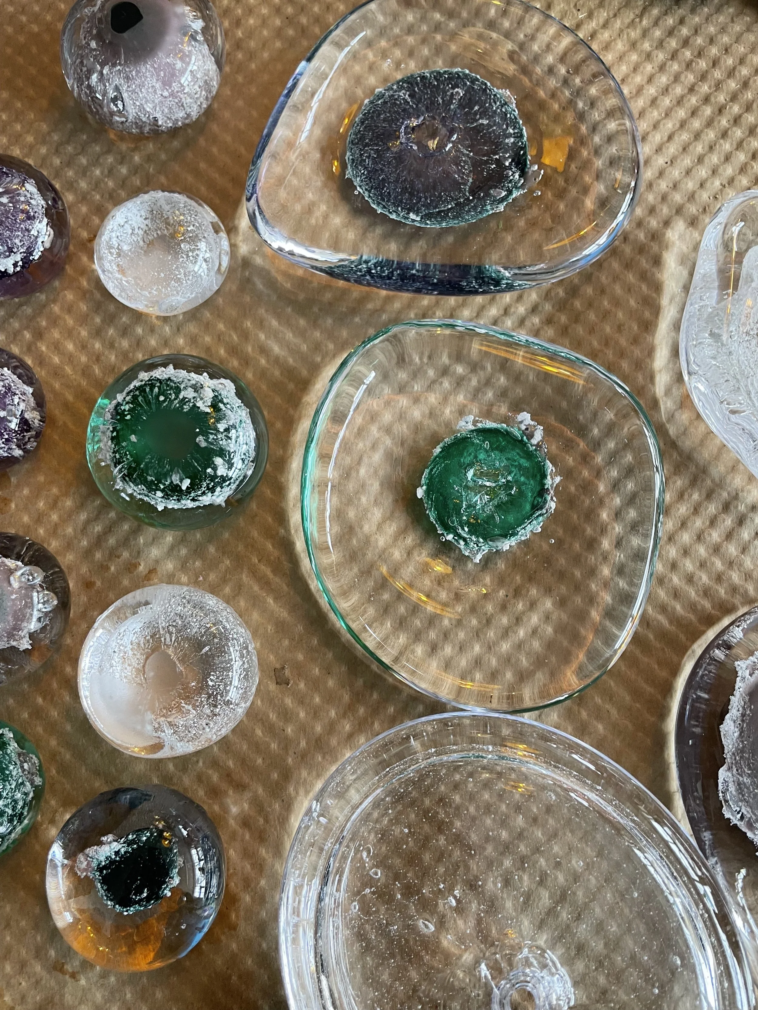A cairn with the ashes of a pet whose passed, suspended within the glass. There will be 3 rocks and 3 glass rocks in the cairn. Pets are possible as well.